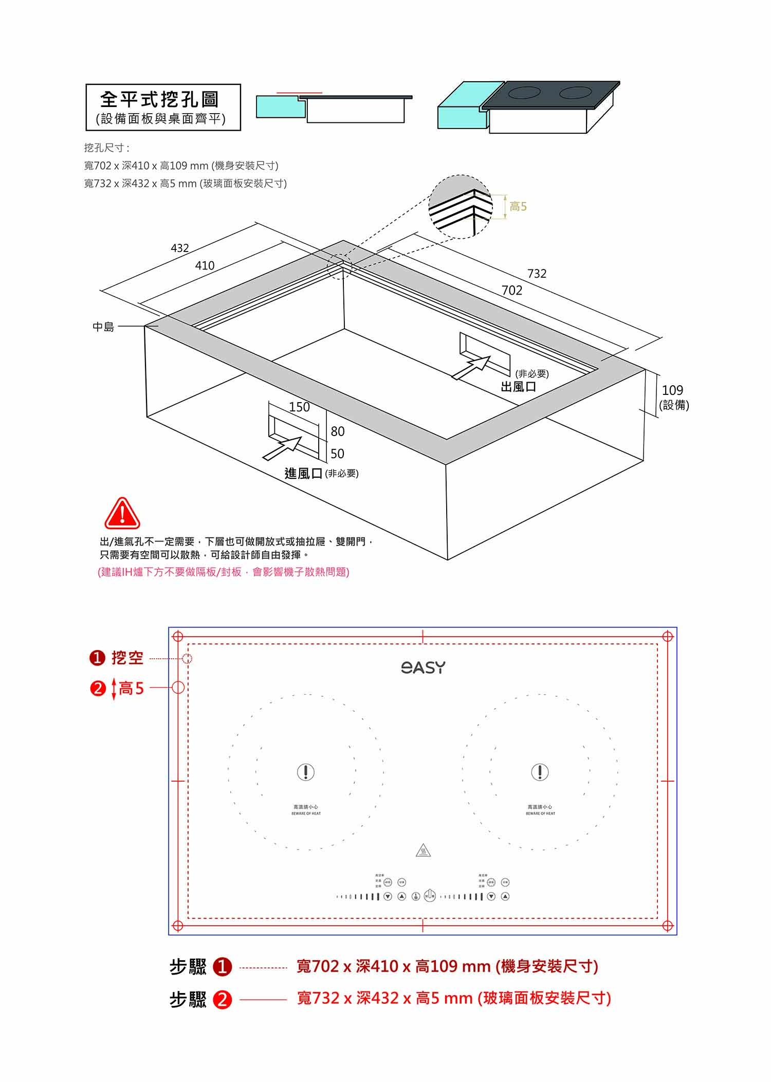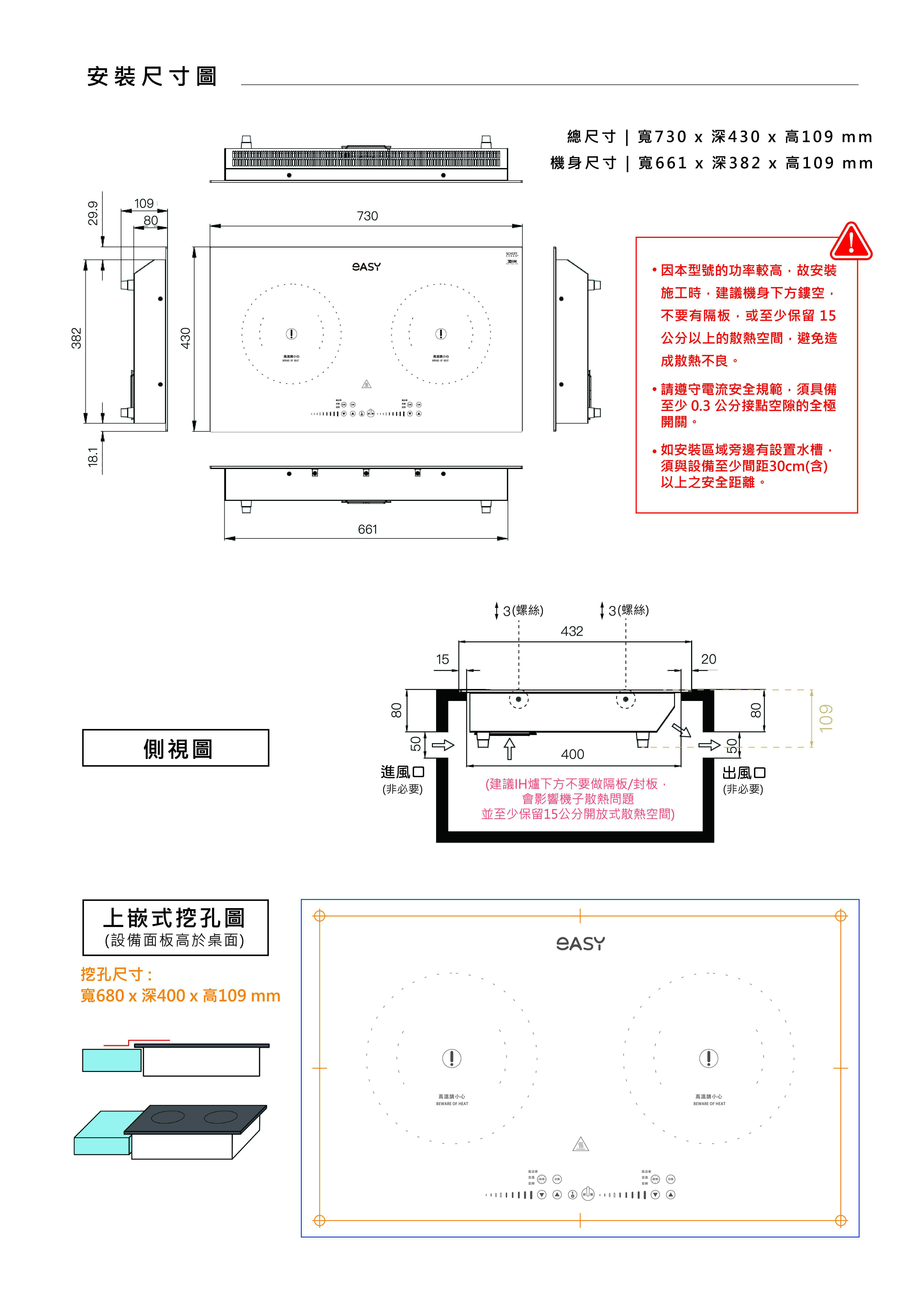 ※注意!因羿麗的 IH 感應爐 / 電磁爐功率比他牌還高,故安裝施工時,建議機身下方鏤空,不要有隔板,或至少保留 15 公分以上的散熱空間,避免造成進風不良。