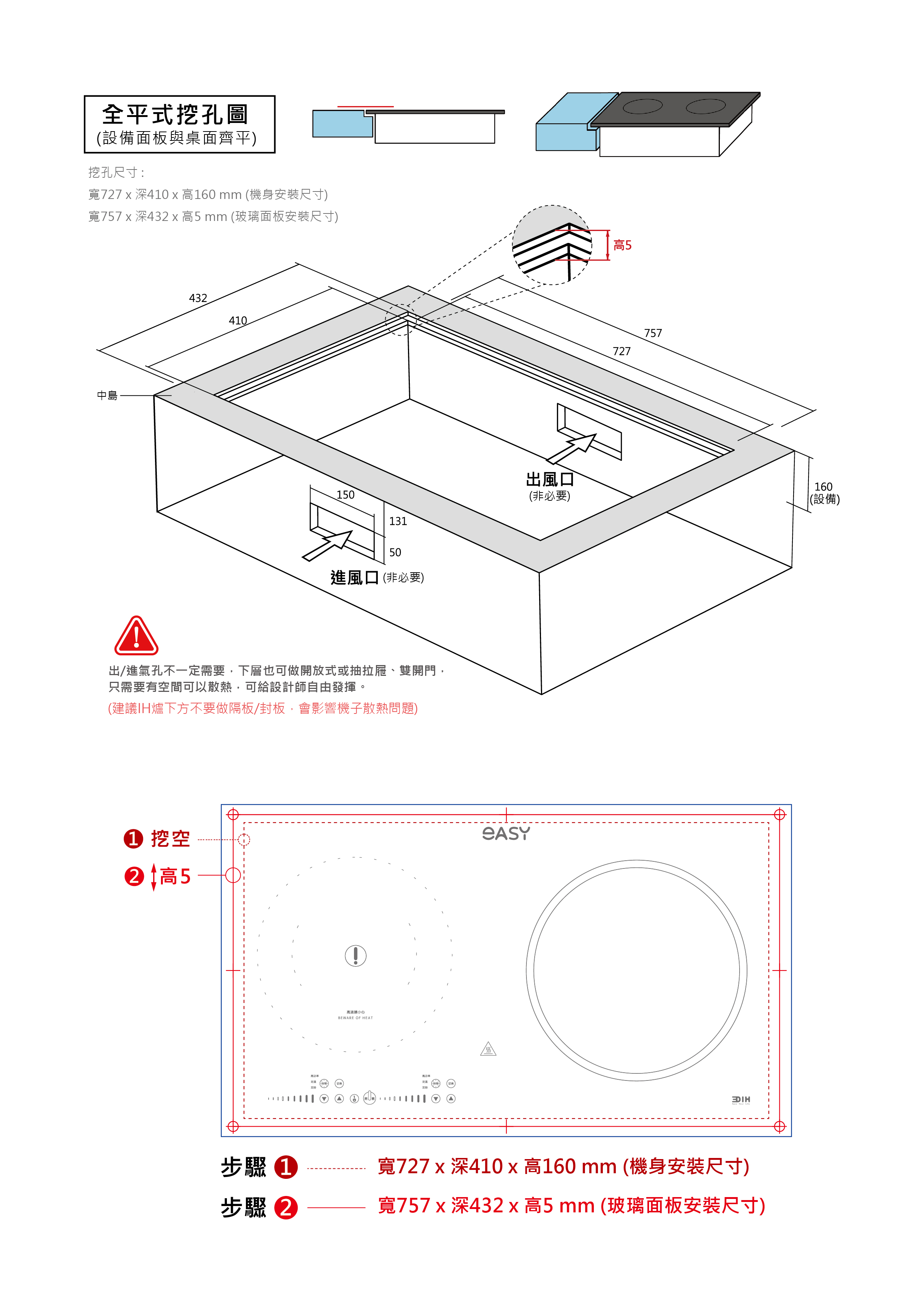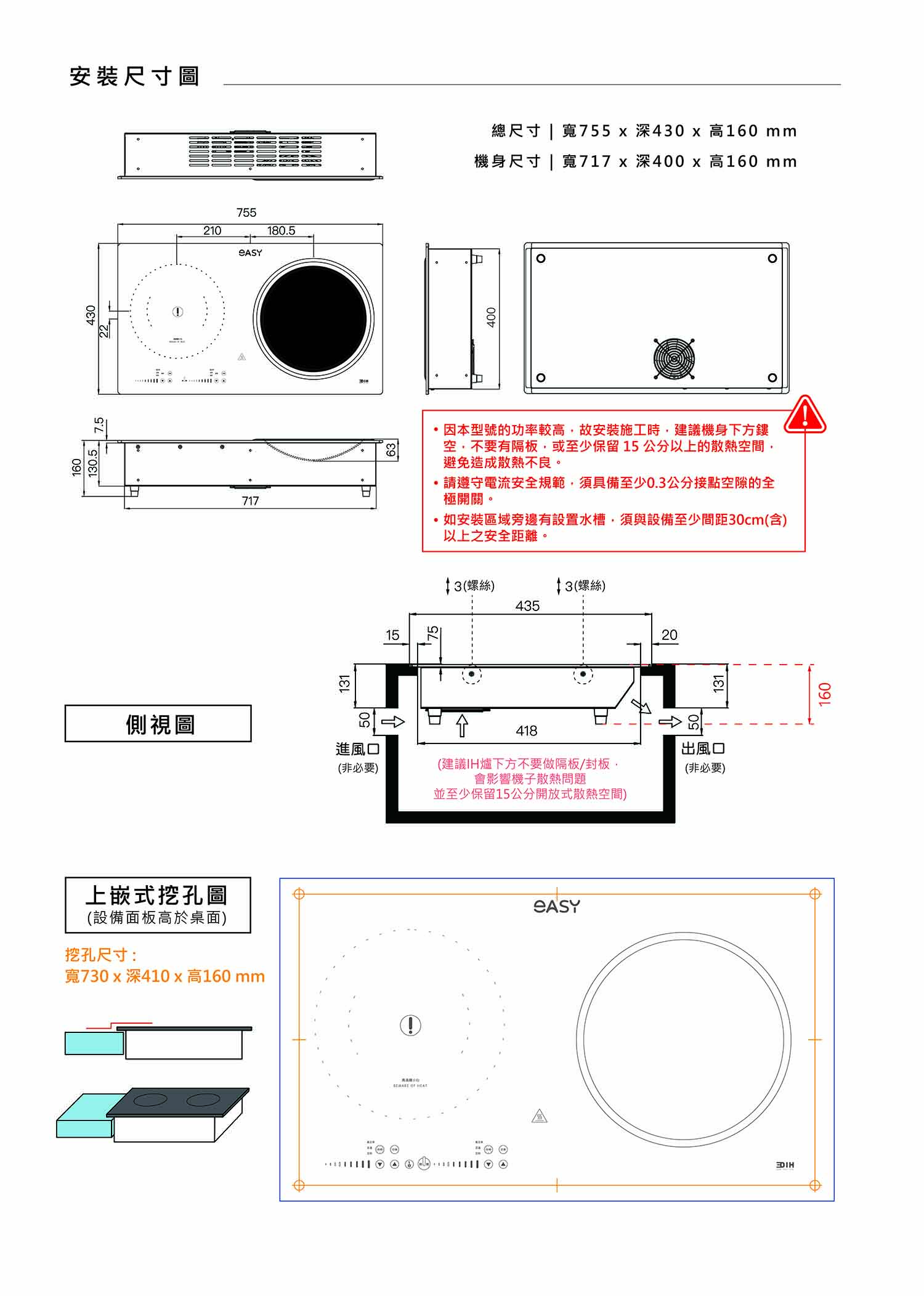 ※注意!因羿麗的 IH 感應爐 / 電磁爐功率比他牌還高,故安裝施工時,建議機身下方鏤空,不要有隔板,或至少保留 15 公分以上的散熱空間,避免造成進風不良。