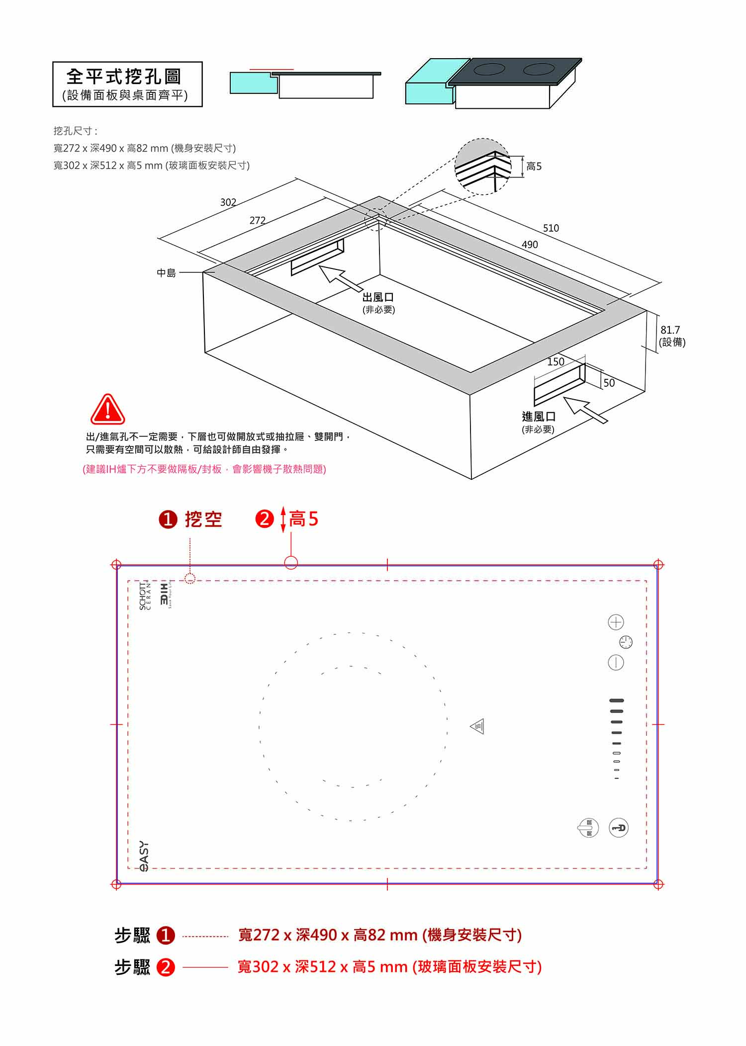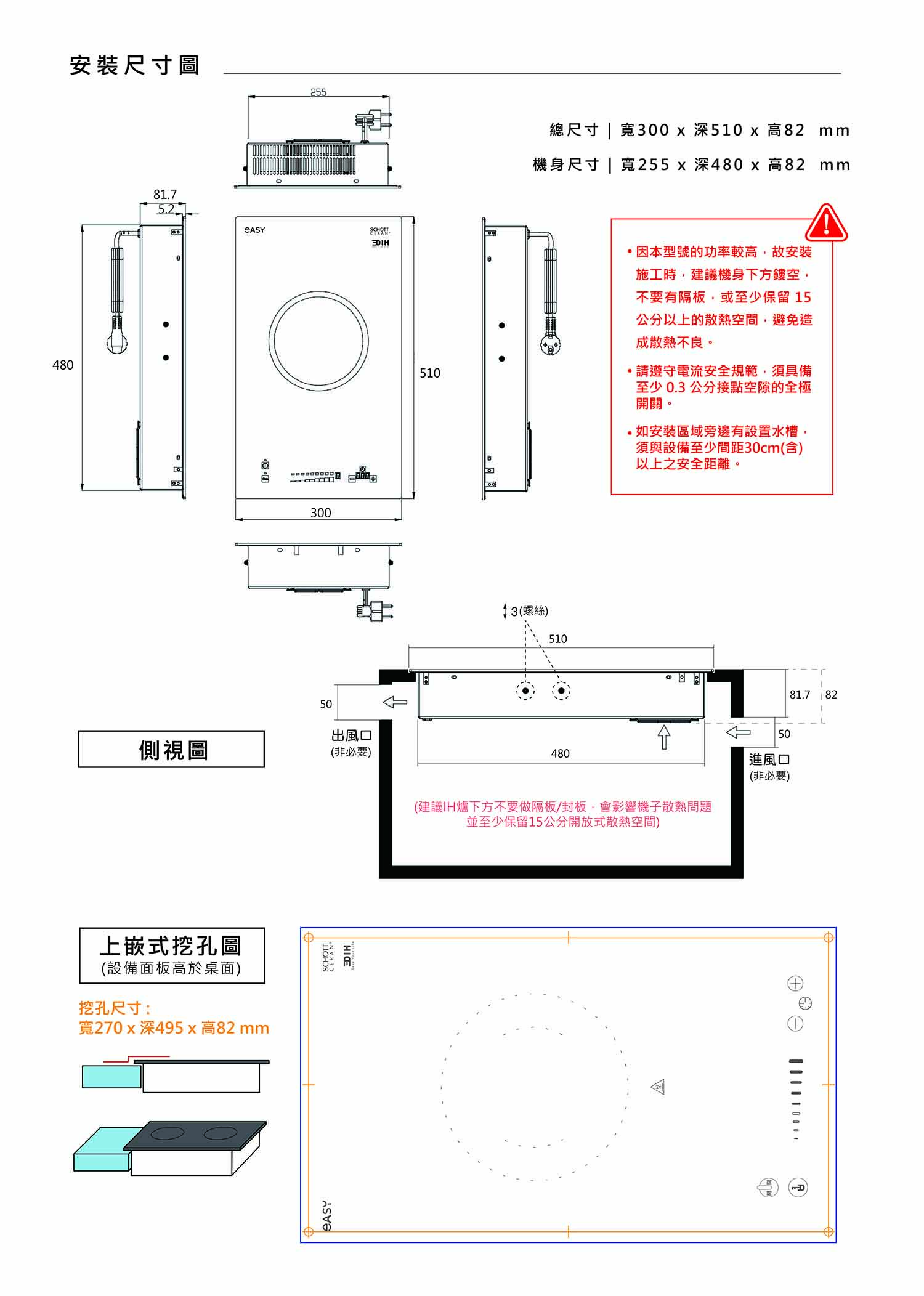 ※注意!因羿麗的 IH 感應爐 / 電磁爐功率比他牌還高,故安裝施工時,建議機身下方鏤空,不要有隔板,或至少保留 15 公分以上的散熱空間,避免造成進風不良。